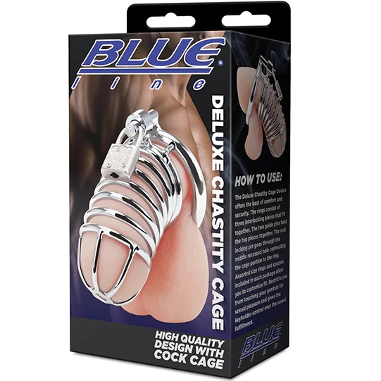 Blue Line Deluxe Chastity Cage firm grip of the steel against your cock as it keeps you in place, no matter how hard you attempt to escape. This Cock Cage keeps your penis in an ergonomically curved enclosure that locks in place with a padlock that secures to a ring that encircles your testicles.