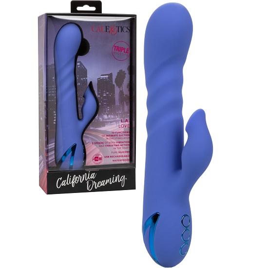 The California Dreaming LA Love Rabbit Vibrator by CalExotics is a dual-stimulating rechargeable women’s sex toy! LA Love Targets your g-spot with its thrusting and vibrating shaft, whilst the rabbit external clitoral stimulator sucks on your clitoris simultaneously bringing you to ecstasy.