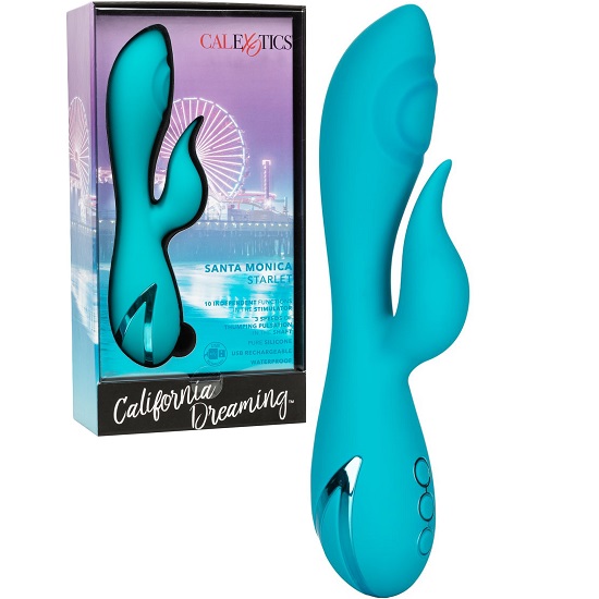 The California Dreaming Santa Monica Starlet Rabbit Vibrator by CalExotics is a dual-stimulating rechargeable women’s sex toy! targets your g-spot with its thumping pulsation in the shaft, whilst the rabbit ear vibrates and flickers on your clitoris simultaneously bringing you to ecstasy.