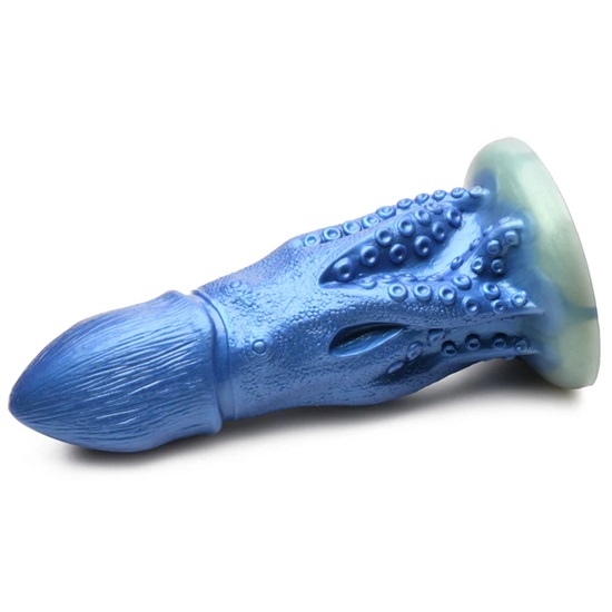 Deep from the ocean depths comes the Creature Cocks cocktopus octopus creature that has come for dark caves and warmer waters. This 8.4″ iridescent blue cocktopus octopus silicone dildo has eyes on the side of its head, eight tentacles with textured suckes on them, and a bulbous head that has a tapered tip.