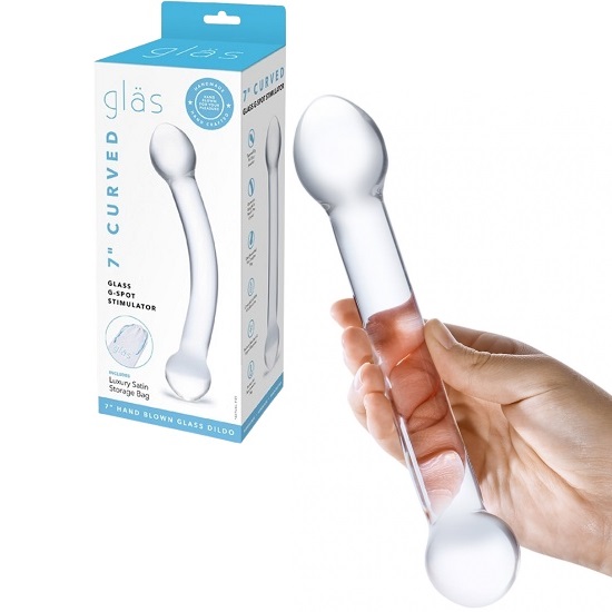 This Glas 7 Inch Curved Glass G Spot Stimulator is double-ended and features a curved body and tapered tip at one end, and a round tip at the other end providing extra sensation for deep g-spot and p-spot pleasures. Not only does this Curved Glass G Spot Stimulator beauty retain heat and cold for increased stimulation, but you can use it with your favorite lubricant, it’s compatible with all of them!